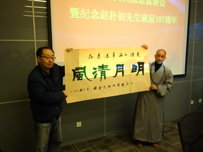 最后,上海市赵朴初研究会分别向民进上海市委和民进上海师大委员会赠送了“明月清风”,“厚德载物”书法作品。