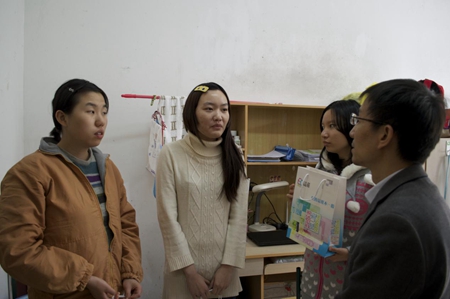 葛卫华一行先后走访了低视力学生所住的26号、43号宿舍楼。在学生宿舍,校领导与同学们亲切地交谈,详细地询问了同学们学习、生活中遇到的具体困难,翻阅了学院为低视力学生提供的专业课专门教材,并现场办公及时解决同学们近期遇到的公共课教材问题。同时,校领导还为低视力学生准备了录音笔方便学生课堂记录,并亲自去学生淋浴室查看设备是否齐全方便。葛卫华强调,一定要确保低视力同学的生活便利,处理好细节问题,让每一个同学都能在师大得到关心和爱护。