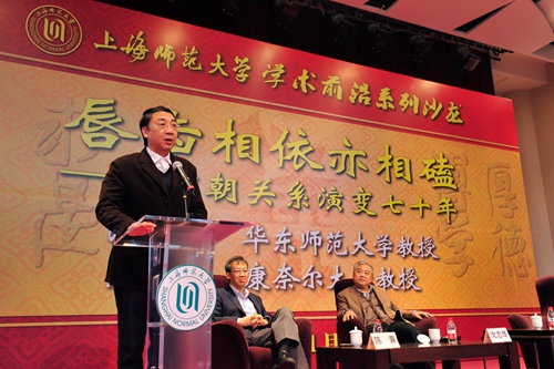 校长朱自强教授致辞。他首先代表学校对两位学者的到来表示欢迎和感谢。他指出,在校庆期间学校举办了很多高端学术活动,营造了良好的学术氛围,今天举行的学术前沿论坛是校庆学术活动的延伸。同时,他在致辞中进一步指出中国要实现国家富强、民族复兴和人民幸福的宏伟目标,需要一个和平的、有利于自身发展的国际环境。中朝关系被认为对东亚政治的风云变幻构成举足轻重的影响,如今朝鲜屡屡下出险棋,中国的反应至关重要;而要理解和研判两国关系的未来发展,对历史的长期分析和研究必不可少。