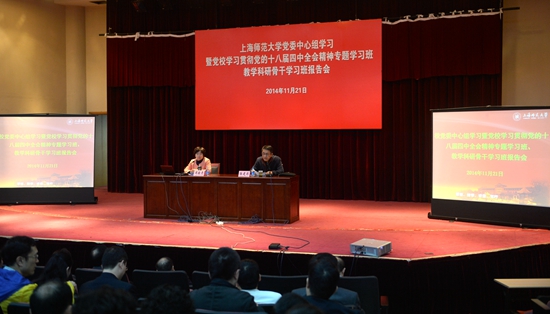 为了进一步学习贯彻十八届四中全会精神,全校各级组织掀起了学习宣传全会精神的热潮,相继组织了一系列研讨会和报告会,邀请了中央编译局郑异凡研究员、北京大学徐天新教授,中国人民大学法学院吕世伦、谷春德、朱景文、史彤彪四位教授,上海交大法学院郑成良教授,上海理工大学陈大文教授等30余位法学、历史学、国际问题研究权威专家,从法学理论层面、历史经验层面共同探讨“依法治国”的现实意义,深入解读十八届四中全会精神,为全校师生全面把握全会精神,提供了很好的理论和现实指导意义。