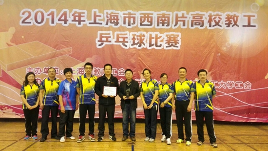11月22日,由市教育工会主办、市教育工会乒乓球协会和华东理工大学工会承办的2014年上海市西南片高校教工乒乓球比赛在华东理工大学徐汇校区体育馆举行,这是首次在西南片高校间举办的教工乒乓球混合团体赛。来自上海市西南片区的20所高校组队参加了比赛。我校教工乒乓球代表队经过奋力拼搏荣获冠军。