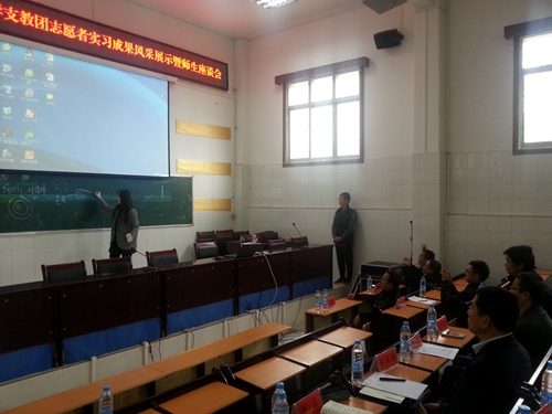 上海师大安龙支教团队长杨润昊同学及队员张艺林同学又分别对支教行动和“千元计划”活动进行了全面总结与汇报。本次支教活动为期2个多月,除开展常规性的教学工作外,还由支教同学们主导组织,陆续开展了多项丰富多彩的活动:高一年级,安龙一中“安龙杯”首届“三对三”篮球赛;高二年级,乒乓赛以及英语书法大赛。既丰富了学生们的课余生活,强身健体,陶冶情操,也增强了班团凝聚力,激发了集体荣誉感。活动得到了全校师生的热烈响应和积极参与,赢得了良好的口碑。
