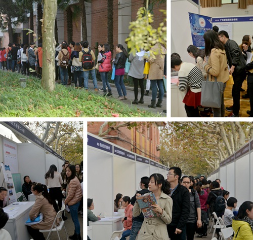 研工部高度重视此次招聘会,根据我校研究生专业设置,并结合2015届毕业研究生的就业特点,注重匹配度,积极邀请基础教育系统、高校和企业参加。研工部在600余家反馈单位中精选了包括上海中学、上海实验学校、上海进才中学、江苏第二师范学院、上海隧道工程有限公司等在内的400余家用人单位前来参会,提供了涉及教育、金融、建筑、传媒等领域的近万个就业岗位,并通过短信、微博、微信等媒介向我校毕业生推送招聘会信息。由于招聘单位踊跃参与,此次招聘会分为球类馆A区和西部大道B区两个区域同时进行,A区主要以示范性高中、高校和企业为主,B区则重点安排小学、初中和幼儿园。同时,此次招聘会还提供后续推荐服务机制,到场同学如果没有找到合适的就业岗位,可在各区县教育人才交流中心提交简历备案,人才服务中心将把这些毕业生信息提供给相关单位。本次招聘会也被纳入了上海市人才服务中心全国人力资源市场高校毕业生就业服务周暨上海市高校毕业生就业服务月系列活动中。据统计,此次招聘会共吸引了数千名毕业生进场求职,其中有相当一部分我校研究生现场与用人单位初步达成就业意向。一些外校研究生和我校本科同学也闻讯赶来参加招聘会。