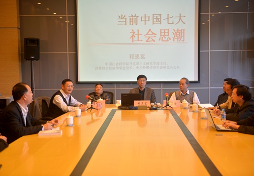 程恩富教授首先对社会思潮的概念做出了界定,概括了社会思潮的现实性、警示性和博弈性,阐述了中国当下存在着“七大思潮”的新观点。他指出,当代社会思潮具有更加注重争夺话语权、更加注重现实利益、传播途径更加多样化、传播范围从精英向大众扩张等特点,并从主要观点、代表人物、代表媒体、社会影响等当面对复古主义思潮、传统马克思主义思潮、折衷马克思主义思潮、新左派思潮、民主社会主义思潮、新自由主义思潮、创新马克思主义思潮作了简要评介,使听众耳目一新。