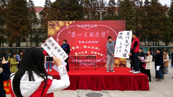 在徐汇校区,本次活动特别增设了上交礼品义卖区,校教育发展基金会也参加了本次活动。在奉贤校区,部分学院通过开展各类特色活动筹集捐款,法政学院学生现场进行书法表演,信息与机电工程学院的学生为大家提供手机贴膜服务,美术、音乐、谢晋等学院学生专程从徐汇赶到奉贤校区,以绘画师生肖像、唱歌跳舞、诗歌朗诵等方式表达爱心。两校区校园内义卖声此起彼伏,现场人头攒动,师生们纷纷慷慨解囊,争相通过捐款或购买义卖品献爱心,师大校园再次涌动起爱的热潮。