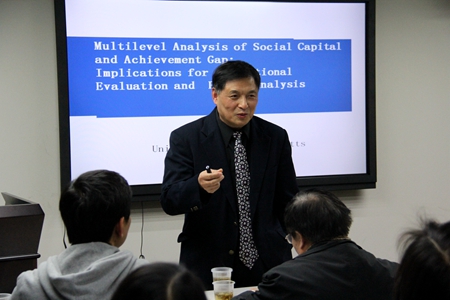 12月15日,马萨诸塞大学教育领导系主任严文蕃教授来我校,作了“Multilevel Analysis of Social Capital and Achievement Gap:Implications for Educational Evaluation and Policy Analysis”的专题报告,教育管理系研究生和部分教师聆听了报告。