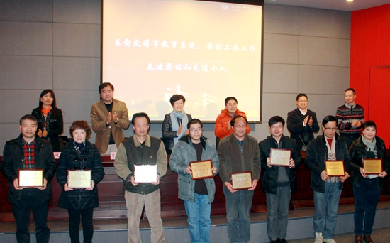 校工会副主席贾铁飞、李凤分别宣读获得2013-2014年度上海市市级和上海师范大学校级荣誉的先进集体和个人名单,所有与会领导为获奖者颁奖。