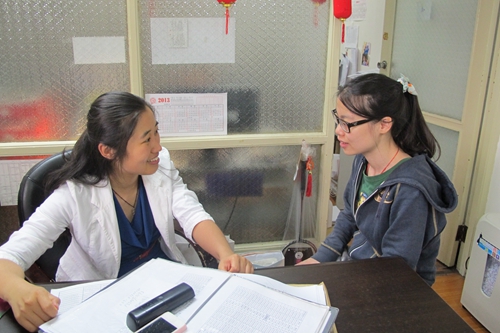 ■ 张葳(左)在和学生交流(资料照片)