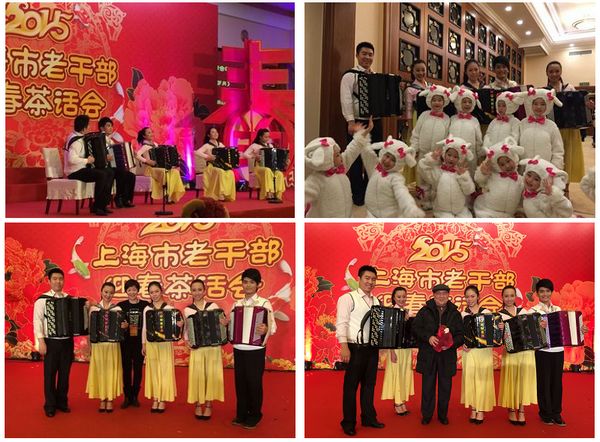 在羊年春节即将到来之际,我校音乐学院手风琴专业学生作为唯一大学生团队,应邀于2月10日在上海展览中心参演2015上海市老干部迎春茶话会。上海市市委书记韩正、市长杨雄及市领导殷一璀、吴志明、应勇、徐泽洲、尹弘、时光辉,和叶公琦、陈铁迪、王力平、龚学平、蒋以任、罗世谦等老同志们欢聚一堂,喜迎新春。