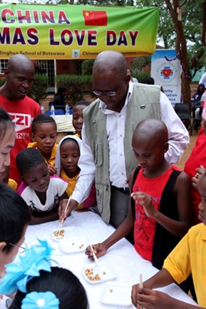 此前,孔子学院还参加了由博茨瓦纳中国和平统一促进会暨华人慈善基金会在土昆SOS儿童村举办的“中博儿童慈善爱心日”活动。中国驻博茨瓦纳大使馆临时代办李南、办公室及领事部孙锦伦主任夫妇等使馆官员、博茨瓦纳总统代表塔里若将军、博副总统兼教育部长马西西代表,教育部常秘理查德马特哈雷等共200多人参加,活动为孩子们捐赠衣物、文具、书籍、钱款,孔子学院老师还现场表演和教授汉语、太极、筷子夹花生等活动吸引了多名中博儿童参与和学习,随后中博两国儿童一起参与拔河游戏将活动推向了高潮。