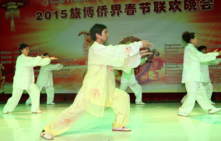 2月7日,博茨瓦纳华人华侨总商会在哈博罗内国际会议中心主办羊年春节晚会。中国驻博茨瓦纳大使郑竹强、博华人华侨总商会会长刘冰、博茨瓦纳中国和平统一促进会暨华人慈善基金会会长南庚戌出席了此次活动。孔子学院武术教师王旭东带领着华人武术爱好者为观众们带来了太极表演,博得现场一致好评。