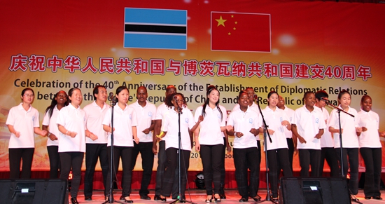 中国驻博茨瓦纳大使郑竹强、博茨瓦纳外交与国际合作部长文松分别发表了热情洋溢的致辞。招待会现场举行了一系列的表演活动,由我校与博茨瓦纳大学合办的孔子学院师生联合合唱团20余人表演了中国民歌《茉莉花》和改编的博茨瓦纳民歌《Ke letsatsi la thabo》(美好的一天),表达了对中国建交40周年的美好祝福。他们将博茨瓦纳传统舞蹈融入其中,边唱边跳,场内嘉宾掌声喝彩不断,将整个晚会推向高潮。晚会最后,由孔院师生领唱《友谊地久天长》,台上台下一同高歌,共同祝愿中博友谊地久天长。