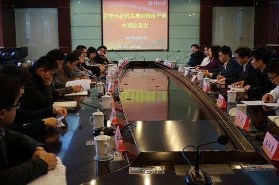 3月17日上午,校第六批机关挂职锻炼干部中期交流会在外宾楼101会议室举行。校党委书记滕建勇与来自12个学院的20名挂职干部出席了交流座谈会。校党委组织部部长、党校常务副校长盛春主持交流会。
