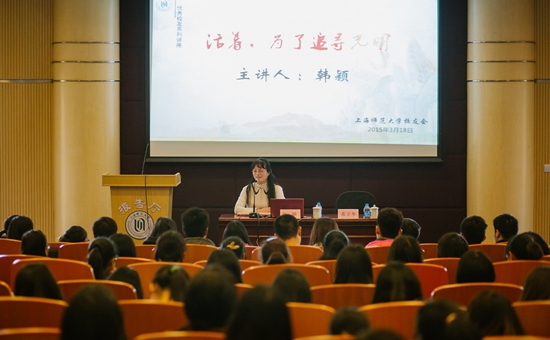 3月18日下午,优秀校友、2014年全国自强不息模范、上海实验学校附属小学盲人教师韩颖回到母校,在奉贤校区图书馆报告厅为师生奉上一场题为“活着,为了寻找光明”的精彩演讲。该场演讲同时也拉开了本学期优秀校友系列讲座的序幕。校党委副书记葛卫华代表学校欢迎韩颖回母校作报告,他介绍了韩颖在挫折与磨难中自强不息的传奇经历。来自人文、外语、法政、教育学院260余名学生认真聆听了讲座。