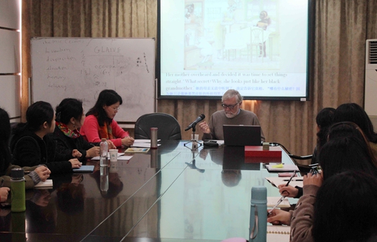 讲座期间,Stephens教授在文学批评方面上,列出儿童文学批评关键概念时间表,阐述不同时间段出现的关键概念,如1988年出现的意识形态批评、1989或1990年出现的互文批评、2000年出现的魔幻现实主义批评、2009年出现的全球本土化批评等。他指出,一种思想理论进入儿童文学批评需要七年,而互文批评则更是经历了二十年之久。通过介绍《国际儿童文学研究》的论文,进一步介绍新的文学批评概念,如全球本土化批评。讲座中,他结合图画书《妮娜•波妮塔》以及青少年小说《双眼皮》的第十五章的片段,具体分析这两部作品的叙事特点。在分析《妮娜•波妮塔》时,他提出了“模式修正”的概念,即对预想观点的心理观点的修正。如图画书中的这只会说话的兔子,既可以被看成是兔子,又可以当人来看,但丝毫不妨碍读者阅读。他用“脚本”来分析《双眼皮》片段,指出此文用了互文性体裁,从主人公乔伊斯的视角描写其心仪对象,利用戏剧化的夸张,达到讽刺的效果。在此基础上,他提出了主体的存在并非取决于主体,而是他者。
