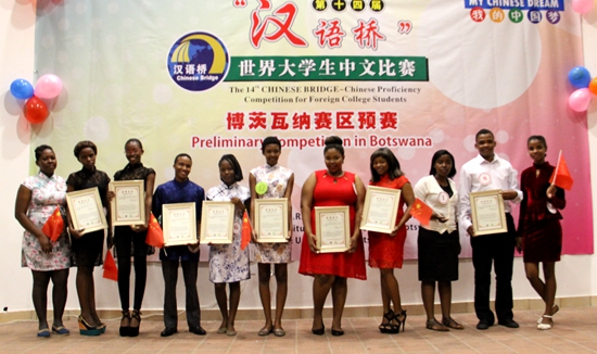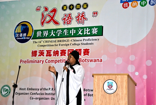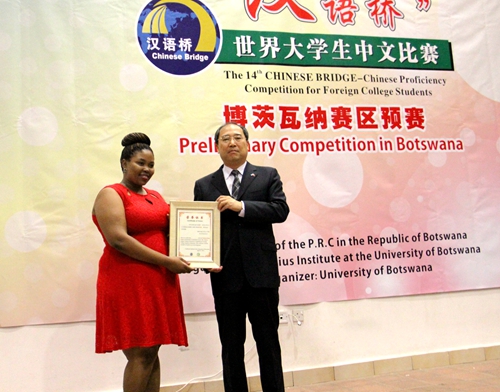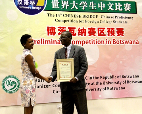经过紧张激烈的角逐,张华(Mogolo Kefalotse Ramalebang)获得了本次比赛的第一名,她的演讲立足中博友谊,希望两国求同存异同心协力,她激情洋溢的演讲获得了一致好评,她将代表博茨瓦纳赴参加第十四届“汉语桥”世界大学生中文比赛复赛;另外一名选手莫爱乐(Gaoele Baikgopotse Mosimanyane)获得了第二名,她将赴中国观摩“汉语桥”比赛。