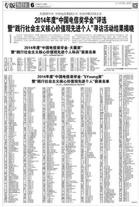 2014年度“中国电信奖学金”评选暨“践行社会主义核心价值观先进个人”寻访活动由共青团中央、中国电信集团公司、全国学联共同主办。活动旨在贯彻落实习近平总书记系列重要讲话精神,深入开展培育和践行社会主义核心价值观活动,发挥优秀典型的示范带动作用,引领广大青年学生学习践行习近平总书记“勤学、修德、明辨、笃实”重要要求。活动自2014年11月启动以来,得到全国高校的广泛关注和青年学生的积极参与,并涌现出一大批践行社会主义核心价值观的青年学生典型。经校级、省级、全国三级推荐、评审,最终产生50名“中国电信奖学金·天翼奖”获得者暨“践行社会主义核心价值观先进个人标兵”、1700名“中国电信奖学金·飞Young奖”获得者暨“践行社会主义核心价值观先进个人”,将共同分享由中国电信集团公司提供的1000万元奖励。