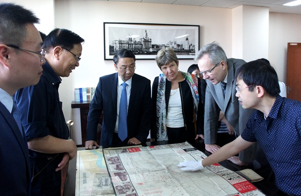 朱自强还陪同瑞纳·克伦普校长走访了人文与传播学院和对外汉语学院。在人文与传播学院,瑞纳·克伦普详细了解了学院的规模、学科设置、专业特色等,参观了教育部普通高校人文社会科学重点研究基地——都市文化研究中心和国家重点学科——比较文学与世界文学。都市文化中心主任孙逊教授介绍了正在研究的课题,展示了一批珍藏的上海老地图,以及手绘长轴画作——《世博胜景图》,并向瑞纳·克伦普赠送了上海城市地图集。比较文学与世界文学学科负责人刘耘华教授介绍了学科当前发展和研究方向,并带领客人参观了教授工作室。