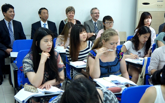 在对外汉语学院,瑞纳·克伦普听取了学院的介绍后,仔细询问了我校留学生人数、对外汉语教学与研究等情况,并走进留学生课堂,亲身感受了我校对外汉语教学的氛围。