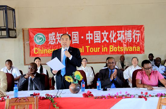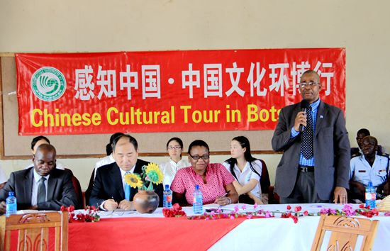 5月12日,中国驻博茨瓦纳大使郑竹强先生、博茨瓦纳教育部代理常秘库勒塞先生以及博茨瓦纳大学人文学院代理院长萨比那先生专程赶赴位于博茨瓦纳东部与南非交界处的库都马泽村庄,出席了孔子学院在该村的迪卡特乎中学举行的“感知中国-中国文化环博行”活动,马哈拉配地区领导、当地政府官员以及校领导和师生及家长代表共600余人出席。