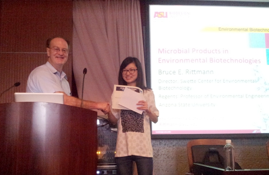 近日,在香港结束的由国际水协会主办、香港科技大学承办的国际水协会第十二届前沿会议(IWA Leading Edge)上,由我校生命与环境科学学院张永明教授指导的环境科学专业2013级硕士研究生汤楹霞,获得了最佳墙报奖第二名。汤楹霞获奖的墙报题目是:“由紫外光解产生的内源电子供体在加速吡啶生物降解过程中的作用”(Role of Internal Electron Donors Generated by UV photolysis for Accelerating Pyridine Biodegradation)。该奖项是从近150篇墙报中,由国际水协权威专家经过严格评选产生的。