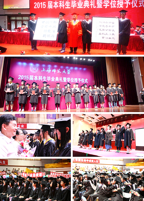 6月17日、18、19日三天,师大校园处处洋溢着收获的喜悦和离别的眷恋,学校沿途的灯杆旗凸显着“砥砺前行新甲子 不忘初心师大情”的2015届毕业季主题。在学校成功举行首场毕业典礼后,各学院在徐汇、奉贤两校区4个会场隆重举行了12场“2015届本科生毕业典礼暨学位授予仪式”。校领导、校学位评定委员会委员、校友代表、学院教职员工、家长代表和全体毕业生代表出席。