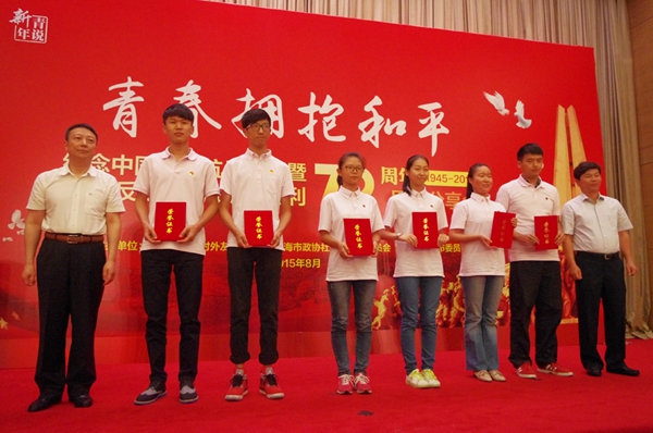 8月18日下午,“青春拥抱和平”纪念中国人民抗日战争暨世界反法西斯战争胜利70周年思想分享会在上海市政协召开。本次活动由市政协对外友好委员会、市政协社会和法制委员会及共青团上海市委员会主办。市政协副主席姜樑、团市委书记徐未晚、新四军老战士代表等嘉宾出席,上海市各高校青年代表也参与此次活动。会上,我校赴延安寻访抗战老兵的大学生社会实践团队师生,代表全市大学生社会实践团队分享了活动感悟。