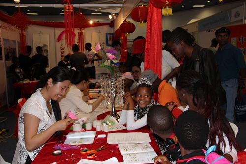 今年孔子学院通过三个展位,围绕和突出“学习中国语言,体验中国文化”主题,展台以“中国红”色调为主,布满京剧脸谱等独具特色的中国文化元素装饰物。孔子学院现场展示了书法、茶艺、剪纸、民族服饰,此次还别出心裁地加入了十字绣和丝网花等中国传统手工艺术的展示和教授,通过全方位、多角度宣传中国历史文化和社会发展,吸引众多参观者驻足观看并参与互动。现场气氛热烈、欢快,洋溢着浓浓的中国文化味道。