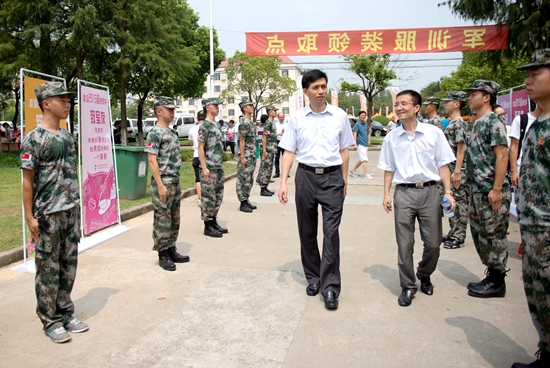 这两天,一抹绿色为校园迎新增添了新的气息和氛围,他们以整齐的队伍、挺拔的军姿、响亮的番号吸引着新生的关注。这是由我校23名退伍兵组成的迎新志愿者服务队。他们放弃暑假休息时间,顶着酷日、冒着大雨,为新生提供校园向导、帮助新生搬运行李、为家长递上一杯“爱心”水,忙碌地穿梭在校园的每个角落。新生小王说,一进校园能有穿着军装的学长热心地指路,并协助拿好行李到达寝室,感到学校很温暖,师大有家的感觉。
