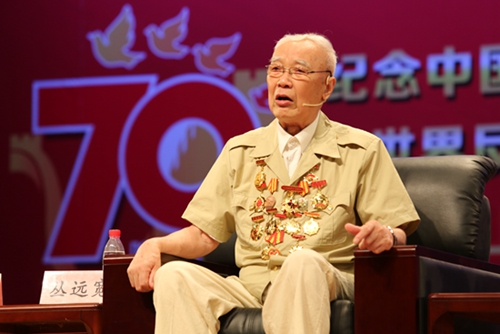 分享会上,上海师范大学离休干部、抗战老兵丛远宽深情讲述了抗战烽火中的成长岁月:曾与日寇殊死搏斗、潜入敌营刺探情报、与敢死队一起攻城……当年正值少年加入新四军的丛宽远老师,如今已是耄耋之年,短袖军装的他身上带满了各种勋章,回想起70年前的抗战场面却还历历在目。“过去,屈辱的岁月,中华人民用战胜侵略者逐步赢得了世界的尊重;未来,建设更美丽祖国的丰功伟业就全靠年轻后辈了。自古英雄出少年,在党的正确领导下,希望当代大学生一定能够能发奋努力,自强不息,发挥聪明才智,把祖国建设得更加繁荣富强。”丛宽远老师寄语年轻一代肩负起历史使命,做民族复兴可靠的接班人。