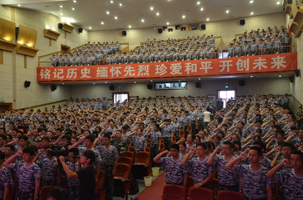 分享会上,两位长者鼓励大学生,正确认识中国共产党在抗日战争中的中流砥柱作用,用历史的理性来增强对现实的清醒,用世界全局的眼光来明晰青年一代对未来的责任。而年轻一代退伍兵则立志做抗战精神的传承者、世界和平的捍卫者、中国梦的实践者。大学生代表用献花的方式表达了对三代军人的崇高敬意。在三位嘉宾的带领下,5050名大一军训学员面向国旗庄严宣誓“铭记历史,缅怀先烈,珍爱和平,共创未来,为祖国繁荣富强奉献青春力量!”