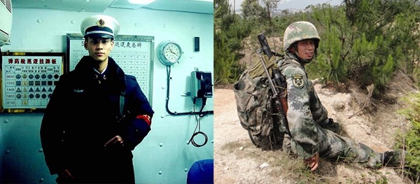 我校入伍学生(左图为华昊冉在舰艇上执行任务;右图为穆亚明在特种作战训练)