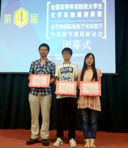 此外,今年暑期,生环学院学生还在全国高等师范院校大学生化学实验邀请赛上分获两个一等奖和一个二等奖。他们与来自全国42所高师院校(含6所部属师范大学)的126名选手同台竞技,经过激烈角逐,获得优异成绩。从首届到今年的第四届,我校生环学院学子已连续四届获得全国高等师范院校大学生化学实验竞赛一等奖。