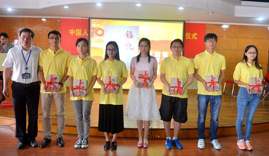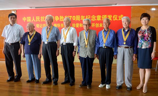 为纪念中国人民抗日战争暨世界反法西斯战争胜利70周年,中共中央、国务院、中央军委向一批抗战老战士老同志、抗战将领、为中国抗战胜利做出贡献的国际友人或其遗属颁发“中国人民抗日战争胜利70周年”纪念章,表彰他们的历史功勋。我校共有11位抗战老干部获得此项荣誉。他们是徐炜、杨景村、韩祥林、张波、丛远宽、张依、李英、陈旭、王福常、宦登华、曹印先,平均年龄超过90岁。9月17日上午,学校隆重举行为抗战老干部颁发中国人民抗日战争胜利70周年纪念章仪式。