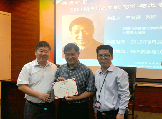 9月28日下午,马萨诸塞州州立大学严文蕃教授受聘为我校特聘教授,副校长刘晓敏为其颁发了聘书。随后,严文蕃教授为教育学院师生举办了一场关于SSCI期刊论文的写作的专题讲座。