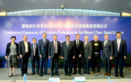 在随后举行的仪式上,朱自强授予Denis Coderre市长上海师范大学的荣誉教授证书并致辞。朱自强在致辞中说,Denis Coderre先生是上海师范大学有史以来第一位外国市长级的荣誉教授。此次活动将有助于学校进一步拓宽教育国际化的思路与视野、提升国际品牌形象,密切上海师大和加拿大各高校间的交流合作。同时也期待在Denis Coderre市长的帮助下,上海师范大学能与蒙特利尔市各界建立更紧密的、更广泛的合作关系,并通过这种关系为中加两国政治、经济、教育和文化交流做出更大的贡献。