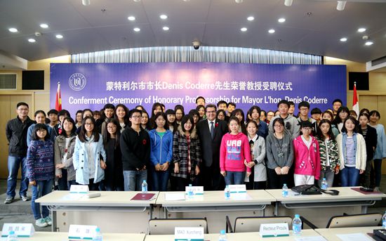 最后,Denis Coderre市长作为上海师大的荣誉教授为在场的学生做了讲演。在讲演中,他从文化、教育、经济、科研、技术等方面介绍了蒙特利尔市的概况。他特别谈到,蒙特利尔是加拿大重要的高等教育中心,是北美大学生人数排名第二的城市,仅次于美国的波士顿;蒙特利尔大区拥有11所大学,根据设在瑞士的世界经济论坛最近的一项研究,蒙特利尔在世界最佳学习城市中排名第八,在加拿大排名第一,在北美排名第二,仅次于波士顿。