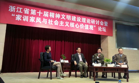 另悉 ,近日在杭州举行的浙江省第十届精神文明建设研讨会暨“家训家风与社会主义核心价值观”论坛上,周中之教授(上图左二)接受了杭州电视台节目主持人的访谈,就家庭文明建设与弘扬优秀传统文化、家训家风与当代青少年教育等问题发表了自己的观点,受到了与会者的欢迎。该访谈过程的视频将在浙江有关媒体播出。