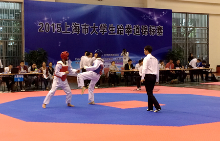 来自复旦、交大、华理等本市31所高校的近500名运动员在跆拳道个人品势、混双品势、团体品势以及个人竞技、团体竞技等项目中展开激烈角逐。我校派出由体育学院副院长沈越担任领队、殷冬军任总教练的校跆拳道队参赛。