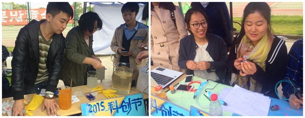 与历届科创节不同,第二十届科创节特别设置了开放日体验活动。机器人社将可编程机器人带到了开放日现场,伴着背景音乐起舞的机器人吸引到了现场观众的目光。生命与环境科学学院食品安全与健康服务部向同学们展示了水球的制作,将化学与食品制作的原理深入浅出地融入到小游戏中。而数理学院则将3D打印的技术带到了开放日现场,同学们可以观看事先制作好的精美有趣的小模型,也可以现场体验3D打印技术,亲自动手制作。正在进行科学体验的2015级的胡琦同学说:“将许多实验室里的研究项目和小游戏相结合,既新奇又生动,也让我对科学创新更加好奇,更有兴趣了!” 在创新创业展区,设有创业现场咨询与STA心理测试等展位,为有创业与就业意向的同学提供建议与培训机会。来自十六个学院的易班工作站也在现场介绍了具有学院特色以及实用功能的各类轻应用。