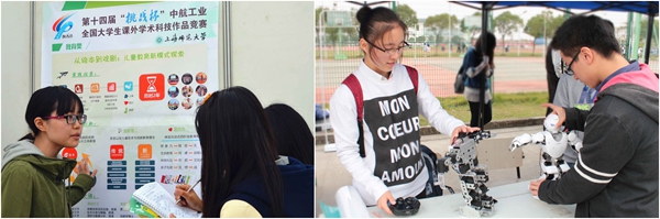 11月11日下午,奉贤校区南操停车场上人头攒动,气氛热烈,在这里代表我校学生课外学术科技作品最高水平的挑战杯国赛项目、致力科学知识普及的科学商店服务部、我校的创业实践团队与学术科创类社团正在与同学现场互动;机器人协会现场展示机器人操作,讲解机器人运行原理,疯狂科学社演示“魔法”实验,同学们现场体验用3D打印笔制作发夹。50个展位前聚集了众多前来咨询和观摩的同学。