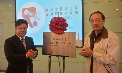 美术学院党总支书记周建平主持会议并致辞,研究生院副院长刘兰英、社科处处长陈恒和基础教育发展中心主任施斌、美术学院执行院长刘旭光教授、台湾师范大学美术系赵惠玲教授、华东师范大学艺术学院钱初熹教授、上海市普教系统美术名师培养基地主持人张家素和上海师范大学基础美术教育研究中心负责人李英梅先后致辞。刘旭光和张家素共同为“基础美术教育研究中心”揭牌。