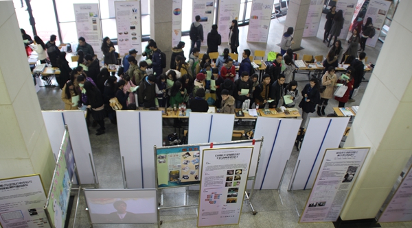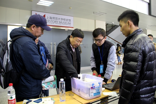 与此同时,在奉贤图书馆大厅进行着展板项目展示和交流。从布展开始即人头攒动,现场的每一位项目负责人都积极向前来参观投票的师生们讲解项目内容、展现各自作品和成果,争夺“我最喜爱的十佳展示项目”,而最终结果由评审专家、学生评委、项目交流学生和观摩学生的现场投票,以及同步的网络投票共同决定。整个会场洋溢着大创的风采与精神。