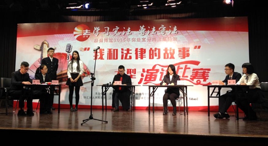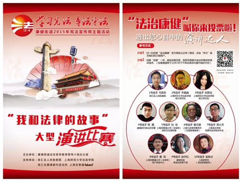 12月7日,由康健街道法治宣传教育领导小组主办,我校法政学院、徐汇区人民检察院、徐汇区康健新村派出所共同合作的“我和法律的故事”宪法主题宣传活动在徐汇工人文化体育中心(五月苑)召开,本次活动中通过小学生“宪法伴我成长”手抄报优秀作品展示、“我和法律的故事”演讲决赛、上师大法政学院学生表演“何以箫笙默”肖像权法律情景剧等环节,从全方位进行了宪法知识的宣传,活动现场聚集了很多周围的民众,让每一位在场的民众感受到了宪法的魅力。我校的学子们以自己的热情大力营造了宪法宣传的气氛,丰富多彩的宪法宣传活动,有效地增强了社区人民群众的法律意识和法治观念,为提升社区群众的宪法意识,努力营造学法、用法、知法、守法的社会氛围,维护社会和谐与稳定贡献出自己的力量。