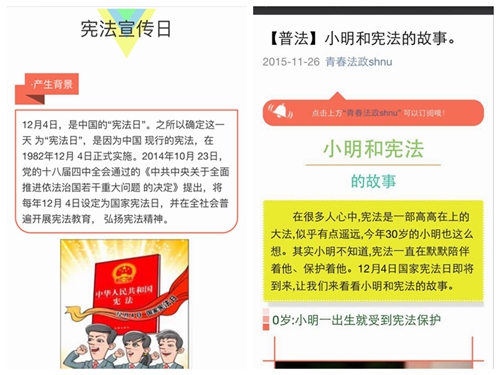在新媒体高速发展的阶段,我校重视新媒体建设,通过线上线下相结合的方式,全方位进行法治宣传。在宪法宣传日之际,我校依托法政学院法学专业资源,在“青春法政”微信公众号开展了系列的宪法宣传活动。