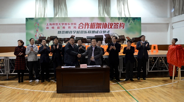 12月10日,我校音乐学院与崇明县教育局合作框架协议签约暨崇明县学校管乐联盟成立仪式,在崇明县正大中学体育馆举行。崇明县教育局局长黄强、副局长黄宗逵,崇明县各初中、小学校长,管乐联盟的九支管乐队,学生家长代表,社区居民代表等近千人参加了此次活动。音乐学院党委书记金国忠分别在《上海师范大学音乐学院与上海市崇明县正大中学教育合作协议》、《上海师范大学音乐学院与崇明县教育局合作框架协议》上签字,校基教中心负责人施斌与黄强为“上海师范大学教育实践基地”揭牌。