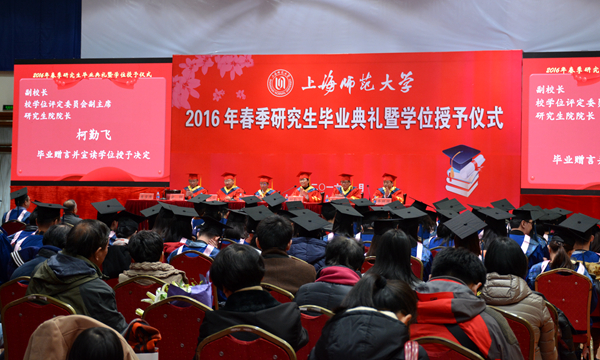 1月10日下午,我校2016年的第一场重要典礼——春季研究生毕业典礼暨学位授予仪式在西部球类馆隆重举行,给寒冷的冬季带来了浓浓的暖意。参加典礼的毕业生主要来自我校英语笔译、公共管理、化学工程等32个专业,共有142名博、硕士研究生获得学位,依依惜别母校。校党委副书记、副校长葛卫华,副校长、校学位评定委员会副主席、研究生院院长柯勤飞,校学位评定委员会副主席韩茂安,校学位评定委员会副主席、教育学院院长夏惠贤,外国语学院院长李照国等出席典礼。参加典礼的还有导师代表、研究生辅导员、相关职能部门人员以及毕业生家属等。典礼由研究生院常务副院长、校学位评定委员会秘书长俞钢主持。