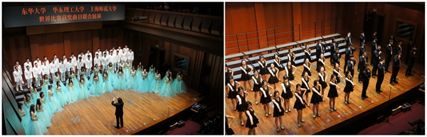 在刚刚过去的2015年里,上海师范大学、东华大学、华东理工大学三所高校的合唱团在多个国际和国内比赛中斩获金奖。本次国际合唱大赛金奖音乐会自去年9月开始筹备,三所高校精心组织,经过近四个月的统筹策划、反复排练,献演了《Twa Tanbou》《雪花的快乐》《心路》《如梦令》《你我》《夜来香》《雪域向往》等16首作品。