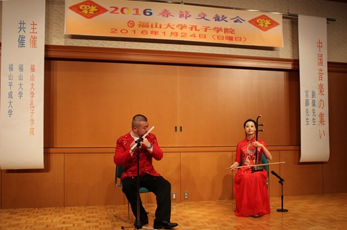 1月24日,福山大学孔子学院在福山大学宫地茂纪念馆分别举行了汉语演讲比赛、春节团圆饭和中国民族音乐演奏会,后面两项是春节联欢会的一部分。本次活动共吸引了100多名当地市民和孔子学院学员参加,气氛非常热闹祥和,当地媒体也进行了报道。