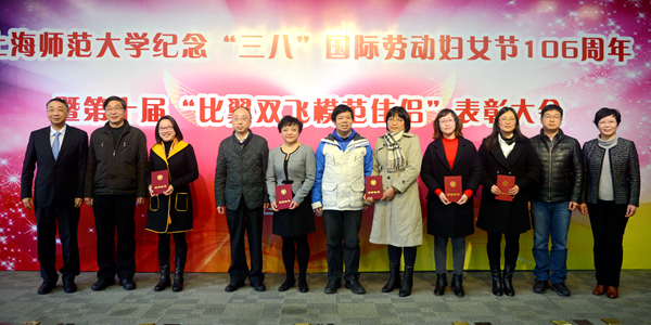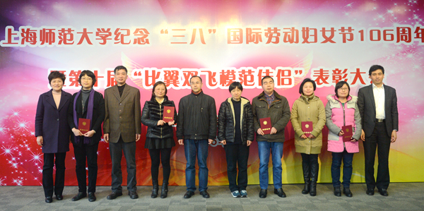 3月9日,上海师范大学纪念“三八”国际劳动妇女节106周年暨第十届“比翼双飞模范佳侣”表彰大会在徐汇校区会议中心二号报告厅举行。会上,一批先进集体和个人受到表彰。校领导滕建勇、朱自强、秦莉萍、柯勤飞出席会议。各单位分党委(党总支)书记及工会主席、女工委员、校妇委会委员、教师代表、获奖集体和个人代表参加会议。